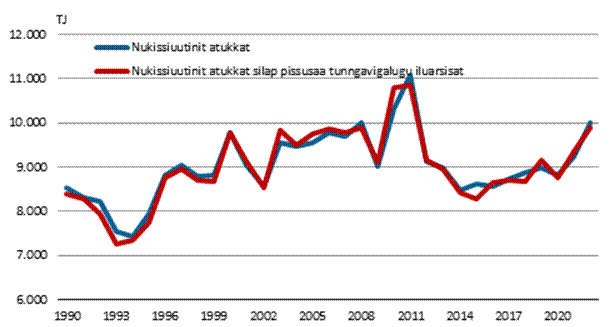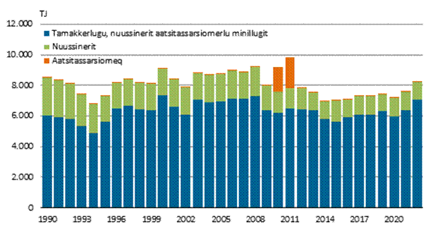 2022-mi Kalaallit Nunaanni nukissiuutinit atukkat 10.002 TJ-upput. 2021-mut sanilliullugit 8 pct.-imik annertunerullutik, taamani atuineq 9.258 TJ-uvoq. Nukissiuutinit atuinerup qaffanneranut nappaassuup coronap akornutaajunnaarnera pissutaanerpaavoq, sanaartornermik suliaqarnerup annertusinera tamatumunnga aamma peqqutaaqataavoq.