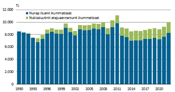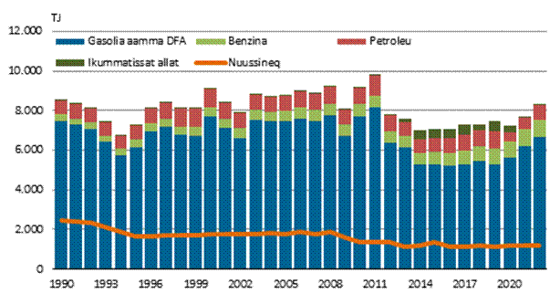 Nukissiuutinit atukkat 2022-mi 17,3 pct.-imik 1990-imut sanilliullugit qaffassimapput. 1990-imi Kalaallit Nunaanni oliat imerpalasut kisimik atorneqarput eqqakkat atorlugit kissamik pilersitsineq annikitsoq eqqaasanngikkaani, taakkulu 1992 sioqqullugu kisitsisitigut paasissutissaatigineqanngillat. 1990-imi nunap iluaniit ikummatissat 8.527 TJ-mik annertutigisut atorneqarsimapput 2022-mi 8.276 TJ-usimasut.