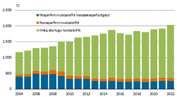 2022-mi nunaqarfinnit innaallagissiorfinni 94 TJ tunisassiarineqarpoq, illoqarfiit kiassaateqarfiini 257 TJ imermillu nukissiorfinnit 1.680 TJ tunisassiarineqarluni. 2009-miilli olia atorlugu tunisassiorneq appariartorsimavoq imeq atorlugu nukissiuutinik atuineq annertusisimanera pissutaalluni. 2008-mi Utoqqarmiut Kangerluarsunnguani imermik nukissiuutip allineqarnerata kingorna imermik nukissiorneq annertusivoq aamma 2010-mi Sisimiuni 2012-imilu Ilulissani nutaanik imeq atorlugu nukissiorfeqalernera, oliamik atuinerup annikillineranut pissutaaqataapput.