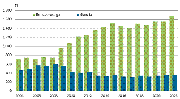 2022-mi innaallagiamik tunisassiornerup 17,3 pct.-ia, 350 TJ, gasolia atorlugu tunisassiarineqarsimavoq. Imeq atorlugu innaallagiamik tunisassiorneq tunisassiornerup 82,7 pct.-ianik annertussuseqarpoq. 2021-mi imeq atorlugu innaallagiamik 1.680 TJ-usimavoq, 2021-mut sanilliullugu 7,9 pct.-imik annertunerusimalluni.