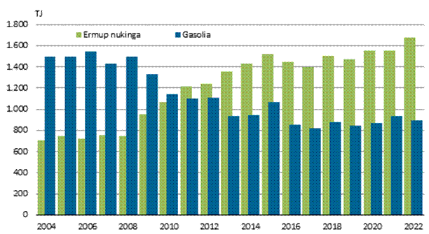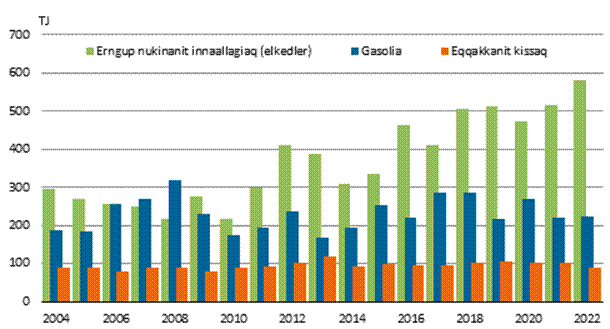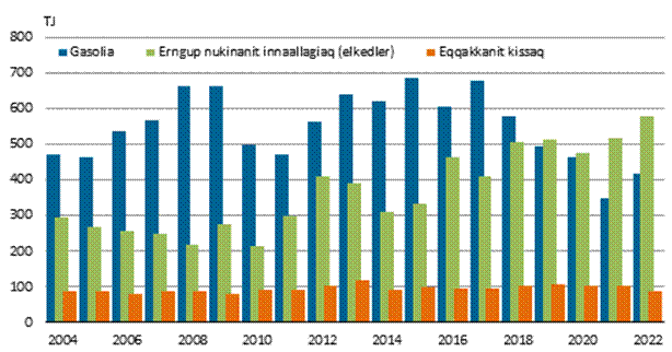 2022-mi ungasianit kissamik tunisassiornermi 418 Tj-usunit ikummatissanit atorneqartunit 38,5 pct.-i kiassaateqarfinnit aamma nukissiorfinnit kiassaateqarfiusunit gasolia atorlugu pisimapput. 8,1 pct.-ia kisitsisinngorlugu 88 TJ, eqqakkanik ikuallaavinniit ungasianiit kissamik pilersuineruvoq. Imermillu nukissiuutit 53,4 pct.-imik annertussuseqartumik ungasianiit kissamik tunisassiorsimallutik. 2022-mi imeq atorlugu nukissiuutit 580 TJ-mik tunisassiorsimapput, 2021-mut sanilliullugu 12,2 pct.-imik qaffasinneruvoq.