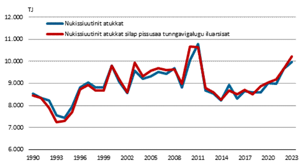 2023-mi Kalaallit Nunaanni nukissiuutinit atukkat 9.976 TJ-upput. 2022-mut sanilliullugit 3,4 pct.-imik annertunerullutik, taamani atuineq 9.646 TJ-uvoq. Nukissiuutinit atuinerup qaffanneranut, sanaartornermik suliaqarnerup annertusinera tamatumunnga pissutaanerpaavoq, kisianni aamma pisortat kiffartuussinerat aamma aalisarneq pissutaaqataapput.