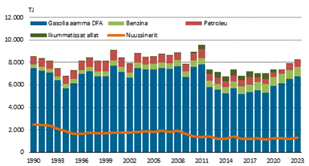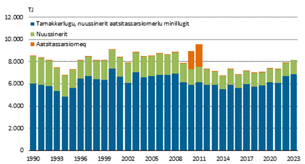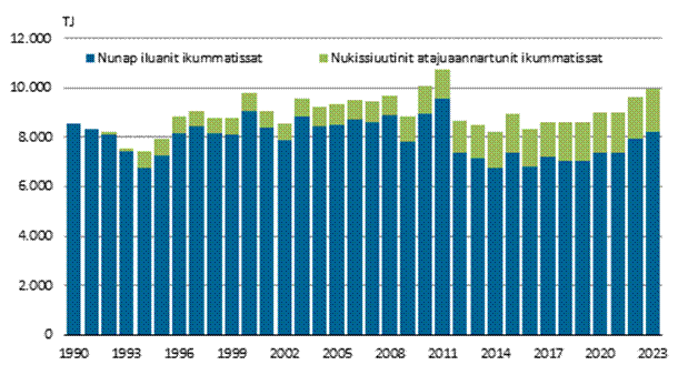 Nukissiuutinit atukkat 2023-mi 17 pct.-imik 1990-imut sanilliullugit qaffassimapput. 1990-imi Kalaallit Nunaanni oliat imerpalasut kisimik atorneqarput eqqakkat atorlugit kissamik pilersitsineq annikitsoq eqqaasanngikkaani, taakkulu 1992 sioqqullugu kisitsisitigut paasissutissaatigineqanngillat. 1990-imi nunap iluaniit ikummatissat 8.527 TJ-mik annertutigisut atorneqarsimapput 2023-mi 8.216 TJ-usimasut.