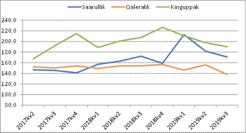 2019-imi kvartalit pingajuanni 2018-imut kvartalit pingajuannut naleqqiullugu kinguppaat, saarulliit qalerallillu akii appariarput