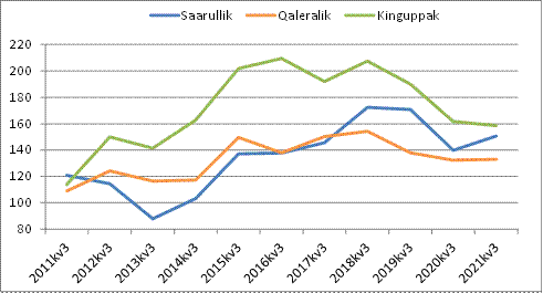 Kalaallit Nunaanni Naatsorsueqqissaartarfiup aalisakkat akiinut naleqqersuutit 2021-mi kvartalit pingajuannut tunngasut saqqummersippai. Aalisakkat tassaapput kinguppaat, qalerallit saarulliillu tunisassiat, 2010-mut oqimaalutarneqartut.