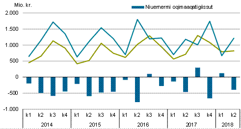 Niuernermi oqimaaqatigiissut taamaalilluni ukiup affaa siulleq 2018-imi amigartoorut 276 mio. kr.-uvoq, tamanna ukiup affaa siulleq 2017-mut sanilliullugu niuernermi oqimaaqatigiissut 328 mio. kr.-inik pitsanngoriarfiuvoq.