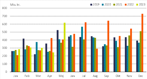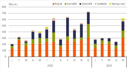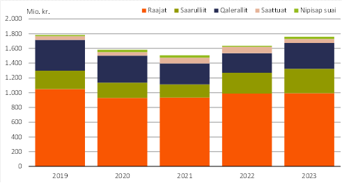 2023-mi januaarimiit maajimut avammut tunisat nalingi katillugit 1.758 mio. kr.-usimapput. Ukiup siulianut sanilliullugit 121 mio. kr.-nik annertunerupput, annertuseriarnerlu katillugu 7,4 pct.-iuvoq. Eqqumaffigineqassaarli naatsorsuutit kisitsisaagallartuummata taamaattumillu kingusinnerusukkut ilarsiiffigineqarsinnaallutik paasissutissanik tamakkiisunik tigusinermi.