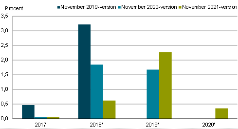 Nedenstående figur 9 viser ændringerne i de nye beregninger af BNP i kædede værdier i forhold til tidligere offentliggjorte beregninger. Ændringerne i de tidligere offentliggjorte tal viser, at den reale vækst i BNP er blevet nedjusteret med hhv. -1,2 procentpoint i 2018 og opjusteret med 0,6 procentpoint i 2019.