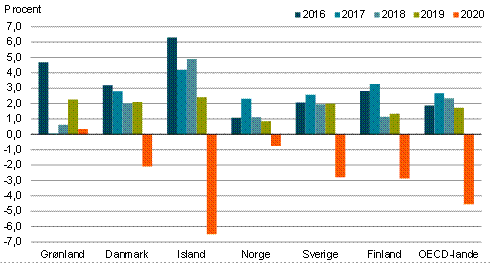 Af nedenstående figur fremgår det, at Grønland er kommet bedre gennem de økonomiske effekter af covid-19 pandemien end de fleste lande, som Grønland normalt sammenligner sig med. Den reale vækst i BNP for 2020 har været positiv i forhold til andre lande i Skandinavien samt OECD-landene. Hvis man tager vækstraterne i perioden 2016-2020, ligger den gennemsnitlige vækstrate i Grønland nu på en delt 2. plads med Danmark.