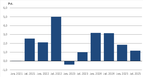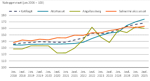 Piffissami januaarimi 2025-miit juuli 2025-mut sanaartonermi aningaasartuutit naleqqersuutaanni ukiup affaanut allannguut katillugu 1,2 pct.-imik annertuneruvoq. Atortussanut aningasaartuutit 2,4 pct.-imik qaffassimapput, Angallassinermut aningaasartuutit 1,3 pct.-inik apparlutik Sulinermilu akissarsianut aningaasartuutit 0,5 pct.-imik qaffallutik.