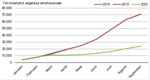 2020-mi januaarimiit septembarimut timmisartumut attartukkamut aamma timmisartumut ilaasartaammut ilaallutik angalasut 25.205-it nunanut allanut mittarfinnit arfiniliusunit aallarsimapput, ukiullu siulianut sanilliullugit 51.823-nik ikinnerupput.