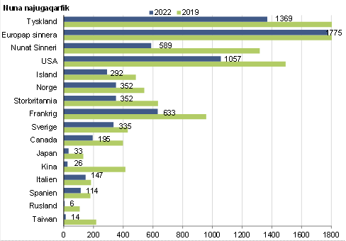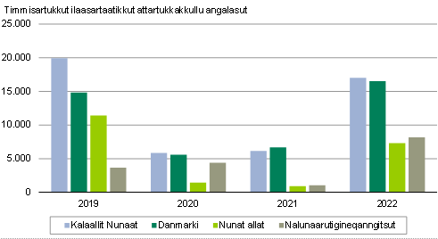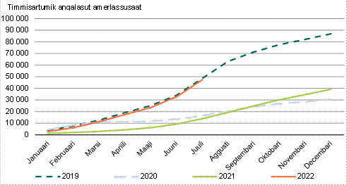 Kisitsisit takutippaat timmisartumik ilaasartaammit nunanut allanut angalasut piffissami januaarimiit julimut 2022-mi amerleriarsimasut. Angalasut amerlassusaat 2019-imi angalasut naligilersimavaat. Angalasut piffissami juulimi 2019-imut sanilliutissagaanni ukioq manna 2022-mi angalasut 42-nik ikinnerupput.