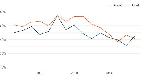 ilinniarnermik aallartitsisimasut suiaassusaat malillugu, 2003-miit 2017-imut