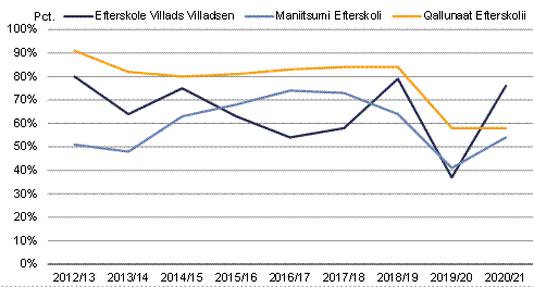 Titartagaq 3. 2012/13-imiit 2020/21-mut naammassinnittarnermut procenti, efterskolit malillugit