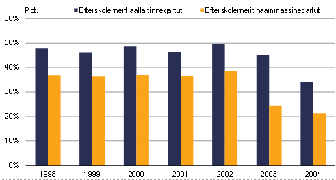 Inuusuttut 2004-rimi inunngorsimasut pingajorarterutai efterskolernermik aallartitsisimapput, 21 pct.-iilu efterskolernermik naammassinnissimallutik. Ukioqatigiinni inuit amerlassusaat 1998-imi 849-miit 2004-rimi 778-inut ikileriarsimapput.